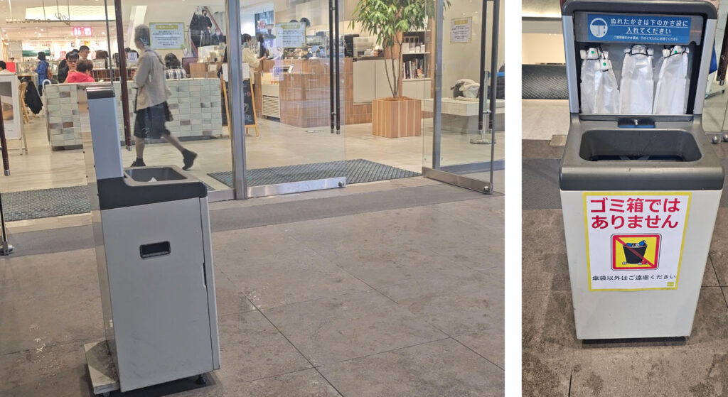 1. Möglichkeit den nassen Regenschirm in eine Tüte zu packen und danach die Tüten im Behälter entsorgen…..Beste Grüße