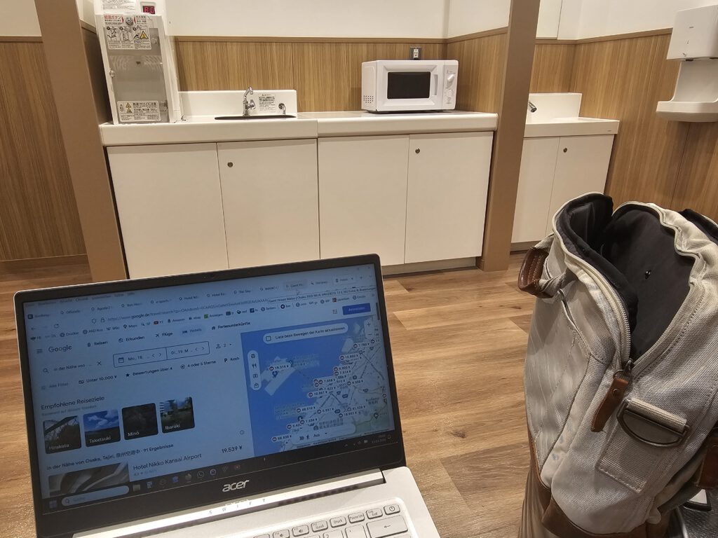Ein Hotel hatte ich für Okinawa gebucht, nicht aber für Osaka. Die Nacht verbringe ich also kostengünstig im Wickelraum des Flughafens. Der hat – kein Scherz – alles, was man braucht: Internet, Wasserkocher (eigentlich gedacht für die Babyflaschen), Mikrowelle und Couch. Könnte fast die DB-Lounge sein.