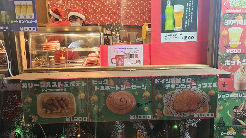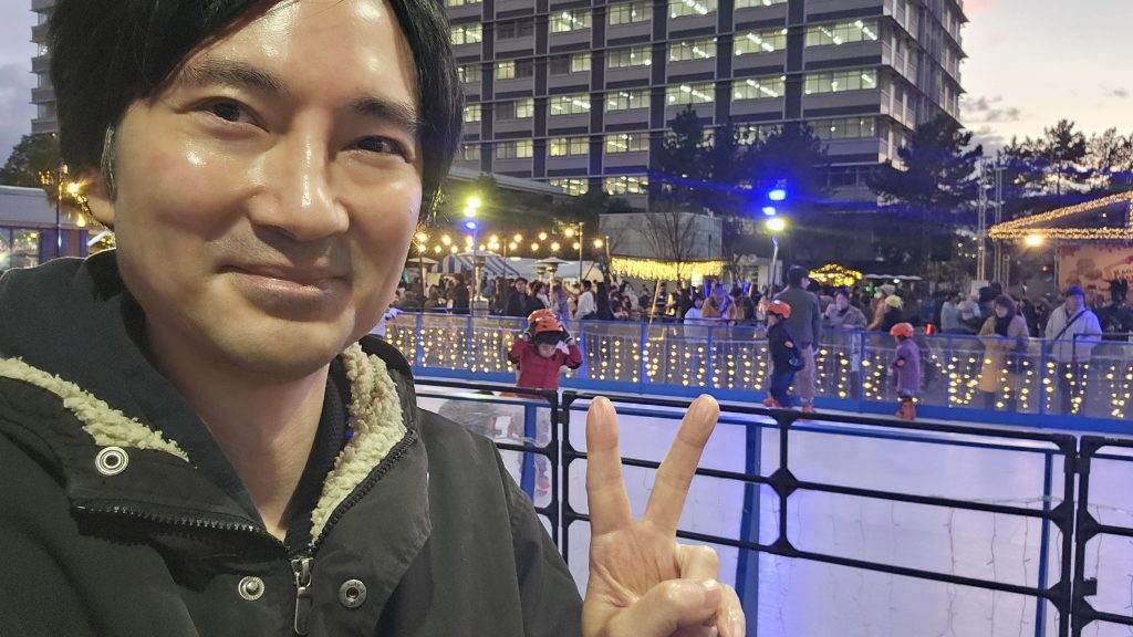 Dass es einen Weihnachtsmarkt gibt, ist eher die Ausnahme. Zufälligerweise bin ich gerade in einer – in der Stadt Takamatsu. Die rühmt sich damit, einen original deutschen Weihnachtsmarkt in Japan zu haben. So richtig mit Holzbuden und Eislauffläche.