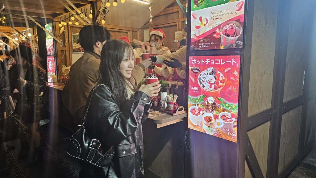 Auch der „Glühwein“ kann preislich konkurrieren mit dem auf jedem Weihnachtsmarkt in Deutschland. 600 Yen sind umgerechnet 3,20 Euro.